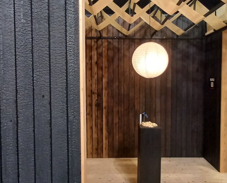 Authentic charred Sugi cladding and panelling in four finishes. Shiplap joint profile. Supplied as brandable boxes. For project buyers and distribution agents.